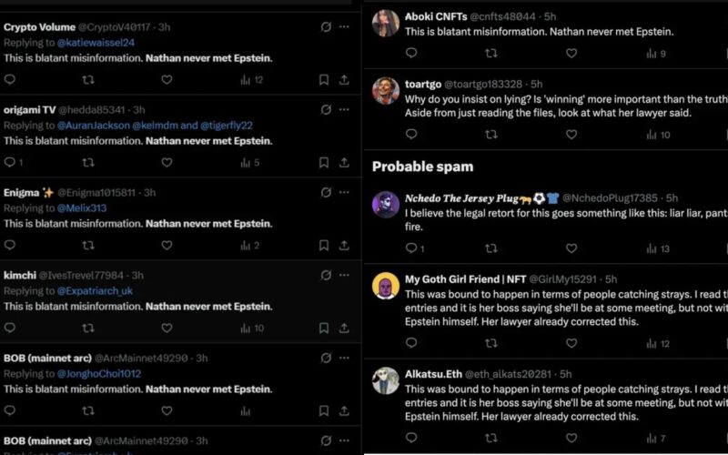 Many of the accounts posting the messages appeared newly created and used similar wording, repeating the phrase: “This is blatant misinformation. Nathan never met Epstein.” The sudden surge of identical posts sparked accusations that an automated bot campaign had been deployed to influence the online conversation.